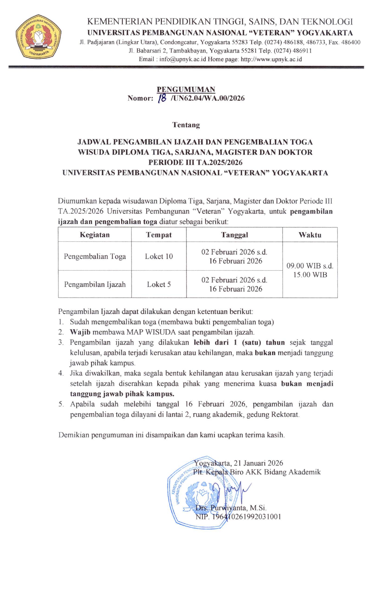 PENGUMUMAN PENGEMBALIAN TOGA DAN PENGAMBILAN IJAZAH PERIODE III (24 JANUARI 2026)
